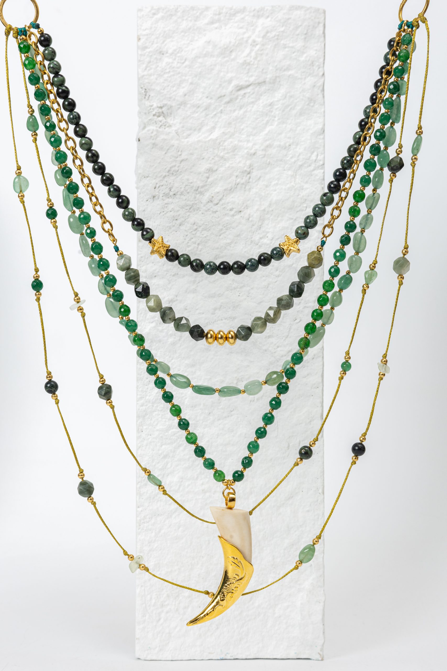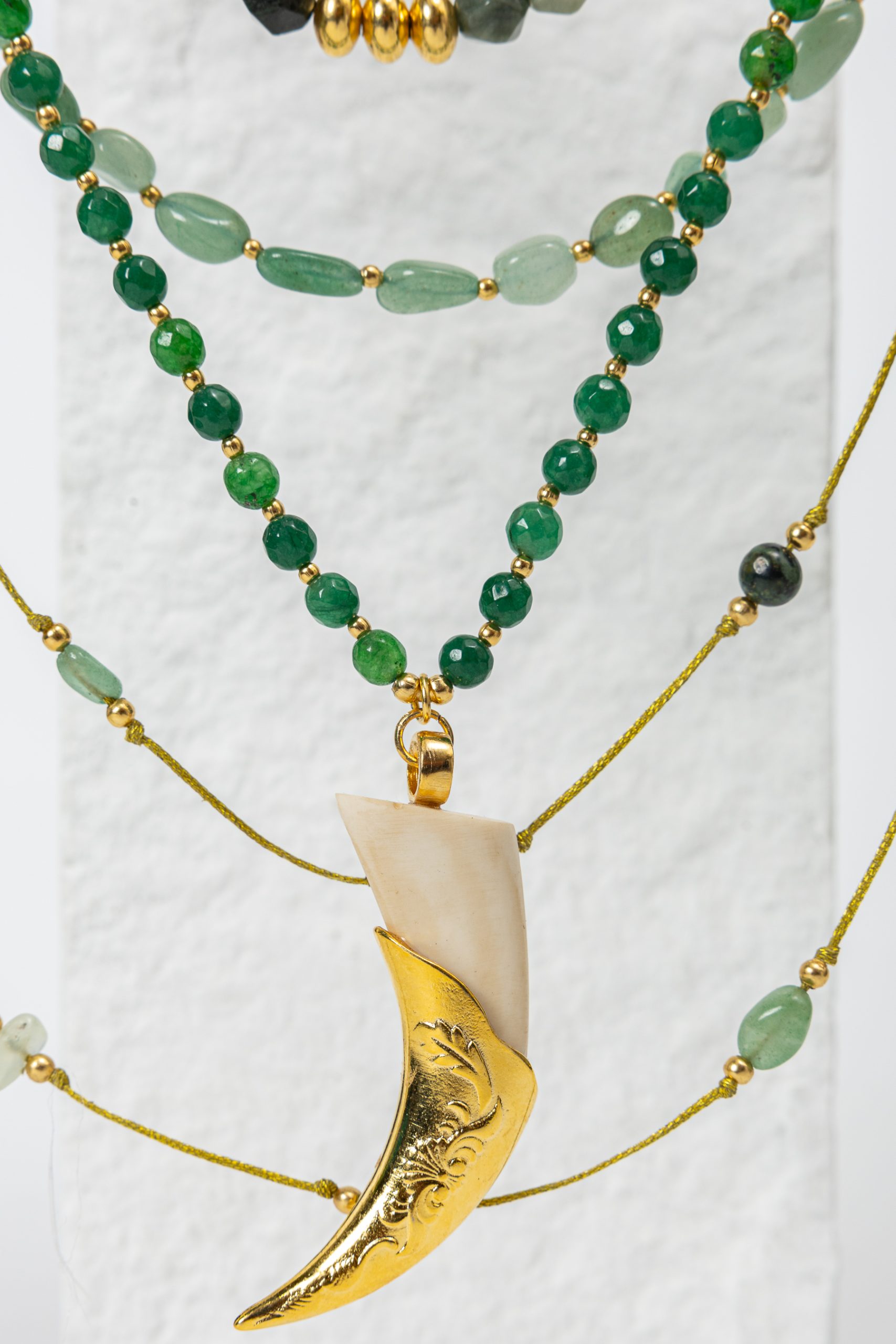 Piedras naturales jade, amazonita y agatas, dije colmilo resina y chapa 14k